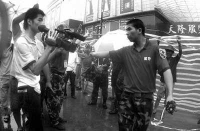 10時15分,來了20余名穿紅上衣、衣服上標有“大同路人防工程”字樣的年輕男子,阻撓記者采訪。拿手機拍照的群眾也遭到威脅。河南日報記者在拍照時,六七名紅衣男子上前,揪住記者上衣領(lǐng)口,反扭其雙手,往機動車道上推搡,記者的上衣被撕爛。市民紛紛指責這些紅衣男子,不去救人,反而扭打記者。