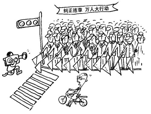 從報道來看,該市行人亂穿馬路的問題并非一天兩天形成的。那么,有關(guān)部門為什么不早日整治,實行長效管理?大張旗鼓啟動“暢通工程”,萬名機(jī)關(guān)干部上街做“志愿者”一定管用嗎?在我看來,良好的交通秩序,光靠萬名機(jī)關(guān)干部一次兩次上街集中勸導(dǎo),舉行一個暢通工程啟動儀式是遠(yuǎn)遠(yuǎn)不夠的。它需要政府科學(xué)規(guī)劃城市交通,需要完善管理機(jī)制,需要每一名市民自覺遵守交通規(guī)則,需要交通秩序管理成為制度常態(tài)。(作者:葉祝頤)