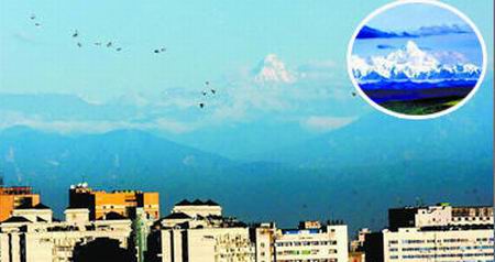 吳傳明將拍到的照片發(fā)到網(wǎng)上,在照片上可以清晰地看到:透過城市樓宇,蔚藍(lán)的天幕下出現(xiàn)了一大片群山。在群山深處,一座潔白的雪峰巍然矗立。尖利的山峰直刺云霄,圍繞在雪峰下的白云清晰可見……