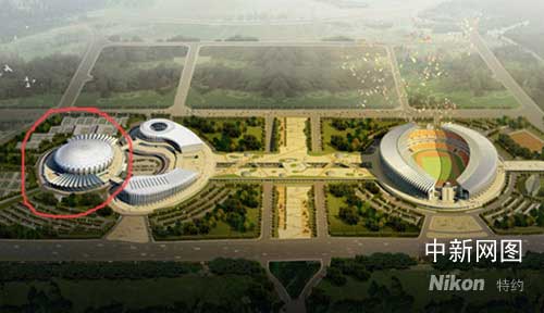 圖為濟南奧體中心設(shè)計效果圖,圖中紅圈所示即失火的體育館。