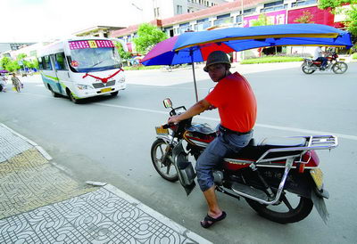 7月3日,湖南常寧市,一名摩的司機(jī)正在休息,不遠(yuǎn)處是免費(fèi)公交車