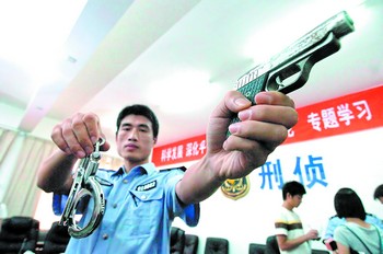 警方展示搶劫團(tuán)伙所使用的仿制手槍和手銬等作案工具。小劉軍攝