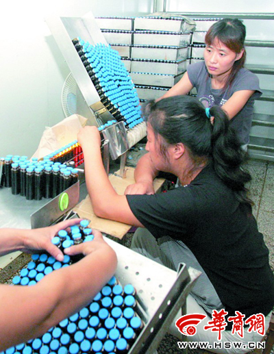 質(zhì)檢之后,褐色藥瓶隨著機(jī)器的轉(zhuǎn)動,滾動在傳送帶上,一張張嶄新的標(biāo)簽被貼在嶄新的藥瓶上,標(biāo)簽被打上了2008年7月生產(chǎn)的字樣。