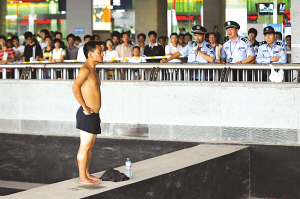 昨天下午3點(diǎn)10分左右,一年輕男子赤裸著上身,下身也僅穿了條黑色短褲,光腳爬上火車站站內(nèi)廣場(chǎng),地鐵通道上的一根橫梁柱上,其腳下就是近10米高的地下通道,據(jù)圍觀市民介紹,該男子手叉腰部?jī)蓚?cè),既不說(shuō)話,也不挪動(dòng)半步。旅客見(jiàn)狀紛紛向該男子叫喊,希望他想開(kāi)一些,可該男子似乎“無(wú)動(dòng)于衷”。