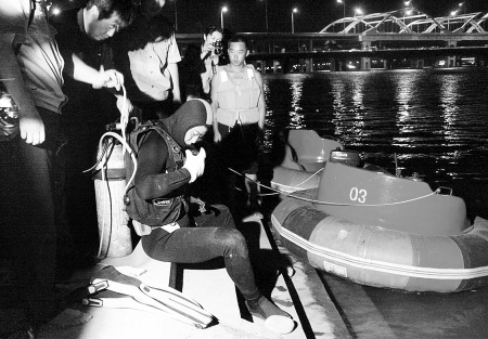 潛水員穿好潛水衣準(zhǔn)備下水搜尋溺水者。 記者 劉珂 實習(xí)生 洪堅鵬 作