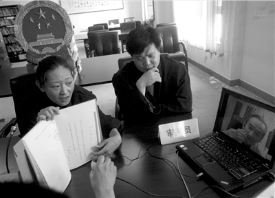 法官通過攝像頭向遠在美國的焦老漢展示材料。 本報記者王儉攝