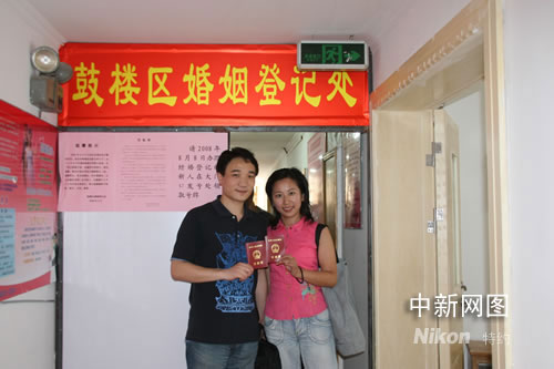 穿著一身鮮紅色情侶裝的許小姐和王先生,在人群里特別顯眼,許小姐調皮的說:要的就是這個效果,領證么就要喜慶點。