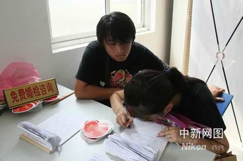圖為一對新人在填寫一系列表格。作 者:牛莉