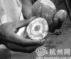 徐土根說,這是他在遂昌金礦做農(nóng)民工的時(shí)候發(fā)現(xiàn)的,一直放在家里。具體地點(diǎn)是在云峰鎮(zhèn)和濂竹鄉(xiāng)交界處的一座山上,“當(dāng)時(shí)只覺得挺好看的,這五六個(gè)像蛋一樣的石頭,小的只有普通雞蛋那么大,最大的也就和鉛球一樣,重量從幾兩到幾斤不等!
