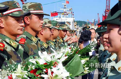 10名戰(zhàn)友上前向執(zhí)行奧運(yùn)安保任務(wù)的海警代表獻(xiàn)花