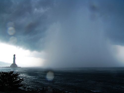 據(jù)目擊到“龍吸水”奇觀的南山景區(qū)工作人員介紹說,今天上午10時(shí)許,在南山寺觀海平臺(tái)處正南方海面上空突然出現(xiàn)一團(tuán)烏云,云團(tuán)一角懸掛著一條形似“龍尾”的烏云斜插入遠(yuǎn)邊的海平線。接著,“龍尾”烏云在海面上漸漸吸起一層海水,沖起約百米高的巨大水柱,一時(shí)間水柱和天上的烏云連接在一起。隨后,這團(tuán)烏云和水柱向108米南海觀音像方向移去。這“龍吸水”的奇觀持續(xù)約10分鐘。