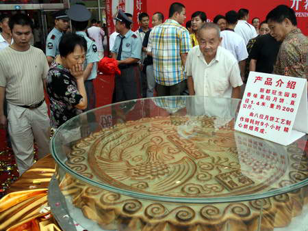 “我們這個鮮花月餅王直徑1.6米,重1600斤,展示完后將免費分給參加月餅節(jié)的市民品嘗!1600斤重的鮮花月餅制作企業(yè)麥的多總經理呂元平告訴記者,月餅面上有八個嫦娥奔月的小圓月餅象征2008年,月餅中間是龍鳳呈翔圖案,四周則有祥云圍繞!斑@個可供萬人分食的月餅寓意四川人民地震后萬眾一心,希望恢復祥和美好新生活的祝愿!眳卧酵嘎墩f,大月餅由二十多個高級烘焙技師花了五天時間才制作完成。