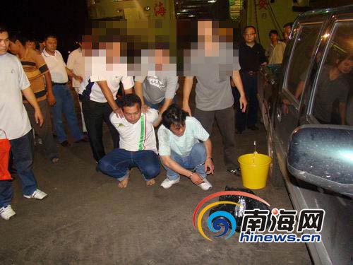 在秀英碼頭,?诰阶カ@兩名犯罪嫌疑人(圖片由海口市公安局提供)
