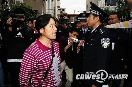 中午10:30 在雨中等待了2個多小時的羅大翠接到一個電話,在通話的過程中,羅大翠的情緒變得更加激動起來,隨即和執(zhí)勤民警交涉起來,試圖越過警戒線,闖進(jìn)法庭。但是兩次努力都被執(zhí)勤民警婉拒。截至27日上午11時30分,周正龍案已經(jīng)開庭審理了3個小時,周正龍妻子羅大翠和兒子仍未被允許進(jìn)入法庭。(記者 錢海峰 陳武)