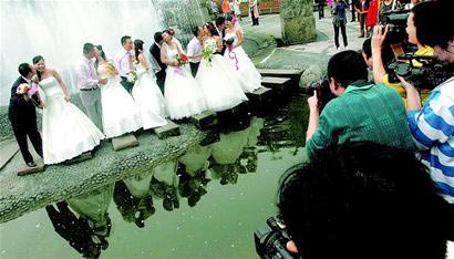 記者在現(xiàn)場看到,合江亭的眾多新人,搞錯對象的畢竟還是少數(shù),但不小心踩了別人的婚紗,親戚跟錯了隊伍之類的事情倒是經(jīng)常容易見到!叭绻麚Q種心情,倒是為喜慶添點氛圍吧!睂Υ,王海安慰自己。