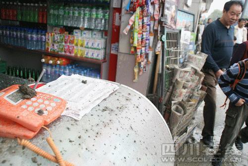 干雜店老板張敏不斷地從屋里掃出泥水。據(jù)她說,下午3點(diǎn)20分左右,她正在店里清理商品,忽然聽到“砰”的一聲巨響,然后就聽到“轟轟”的聲音,緊接著飄來濃濃的刺鼻氣味。張敏忙往外一看,離店鋪僅兩米印有“成都排水”字樣的綠色施工防護(hù)墻不斷晃動(dòng),沙石隨著黑色的煙霧直沖進(jìn)屋子,“我以為又地震了!睆埫翥读俗阕阋环侄噻姡畔肫饋硪馀。跑到門口時(shí),她看到整條街上一個(gè)行人都沒有了,其他店鋪的商家已往安全地帶跑去,慌亂之際,她來不及拉上卷簾門便直接往一環(huán)路方向跑去。