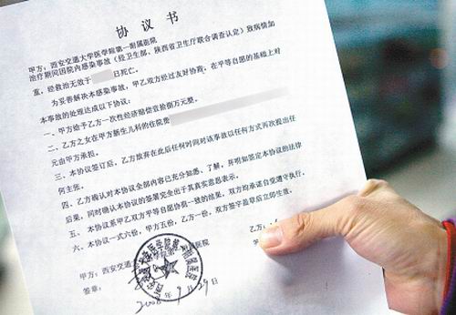 記者從一位家長(zhǎng)手中拿到了這份協(xié)議書。協(xié)議書的甲方為西安交通大學(xué)醫(yī)學(xué)院第一附屬醫(yī)院,乙方為患兒家屬。協(xié)議書的內(nèi)容如下: