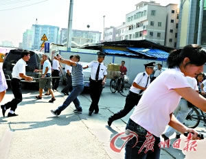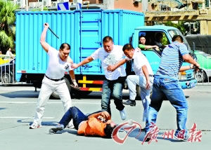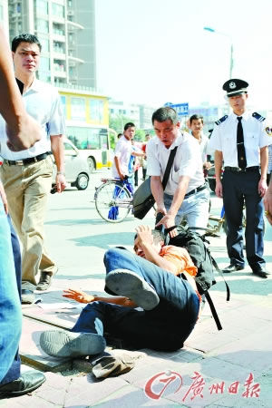 廣州日?qǐng)?bào)10月18日?qǐng)?bào)道 昨天上午10時(shí),廣州市中山大道,四個(gè)壯漢當(dāng)街毆打一名《廣州青年報(bào)》的送報(bào)員,兩名白色衣服的保安自始至終在一邊旁觀。后來,有市民上前勸說阻擋,并協(xié)助警察將其中兩名犯罪嫌疑人抓獲。