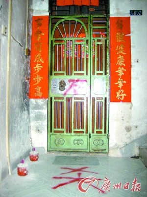 記者于當(dāng)天上午10時接報來到該住宅小區(qū)了解情況。在該小區(qū)一名知情的居民蔡先生的帶領(lǐng)下,記者見到,至華 苑小區(qū)6座的302、602、303、403四戶人家的防盜門上均被寫上“殺”、“死”兩個字,其中兩家門外的白墻也被噴上類似詛咒語。黃先生家在602,他家的門和門外的地板瓷磚都被噴上詛咒語。