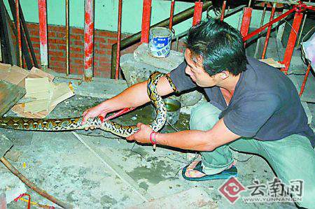 前日凌晨5點(diǎn),接到景洪市畫家楊洪榮的熱線電話,記者從睡夢中躍起,驅(qū)車趕到位于版納氣象局住宿區(qū)內(nèi)的一間民宅。只見其二樓陽臺上燈火通明,7名男女的身影正在樓上緊張地晃來晃去,原來,楊洪榮的家中發(fā)現(xiàn)了一條手臂粗的蟒蛇,幾人正在與蟒蛇進(jìn)行著激烈的搏斗。