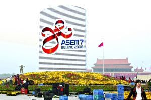 昨天,天安門廣場中心花壇基本完成“變身”,第七屆亞歐首腦會議標(biāo)識在廣場上亮相。李剛攝