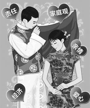 “結(jié)婚生子、白頭偕老的婚姻觀依然占主導(dǎo)地位!毙彀茬髡f,65.6%的人贊同“不管怎么說,人總是要結(jié)婚的”,反對的為15.2%;72%的受訪者贊成“婚姻是神圣的,結(jié)了婚就要白頭到老”,不贊同的僅為6.7%。此外,84.4%的人反對“結(jié)婚后不要孩子”,對“丁克”家庭持肯定態(tài)度的僅占1.6%。