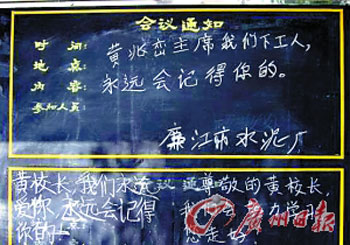 廉江一中的學生在黑板上留言紀念黃兆巒。戚照攝
