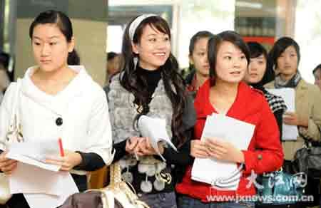 在南昌航空大學(xué)就讀的一位大四學(xué)生告訴記者,此次連自己共有6人來(lái)面試,但目前只有兩人進(jìn)入復(fù)試,其余4人就是卡在英語(yǔ)關(guān)和反應(yīng)能力的考驗(yàn)上。記者在現(xiàn)場(chǎng)看到,進(jìn)入面試的應(yīng)聘美女在填寫(xiě)個(gè)人簡(jiǎn)歷時(shí)也必須用英文。