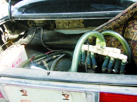 “為了避人耳目,大鐵箱被用布蓋著。鐵箱上連著直徑有5厘米粗、內(nèi)有鐵絲的硬質(zhì)塑料管,五六米長的管子上安裝有閥門、連接有油泵、進出油過濾油器、開關(guān)等。原來轎車就是用這根‘長鼻子’把大貨車的油偷走了!崩罹该髡f。