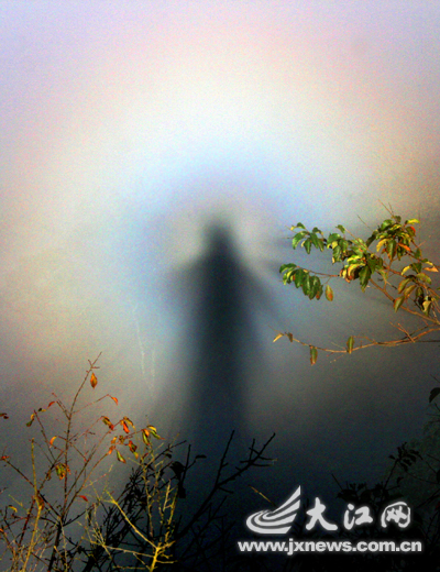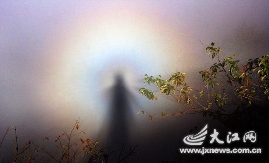 10月27日上午9時20分,井岡山黃洋界景區(qū)出現(xiàn)神奇瑰麗的云海日暈景觀。光圈中央像是一個人的影子,虛明如鏡,外圍呈現(xiàn)出紅、橙、黃、綠、青、藍(lán)、紫互相交織的七色光環(huán),整個光圈由遠(yuǎn)及近,由大變小,持續(xù)時間長達(dá)40分鐘之久。