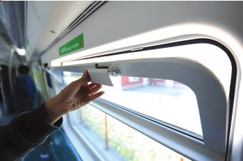 4號線列車內(nèi)部最特別的地方是車窗。普通列車車窗是全封閉的,但4號線列車每個車窗的上弦窗都可開啟。乘客只需抬起上弦窗部開關,上弦窗便可自外而內(nèi)向上開啟30度。這樣既滿足了乘客對車內(nèi)通風的緊急需求,也保證車窗打開后列車安全運行。