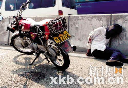 劫匪駕車高速轉(zhuǎn)入南海大道時,與路過的車輛發(fā)生碰撞失控倒地,劫匪欲翻越護欄逃跑時被民警阿偉抓獲。