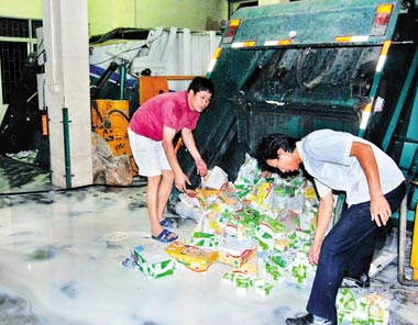 昨晚7時許,兩車不合格液態(tài)奶在廣州石井潭村垃圾壓縮站銷毀,壓縮后的液奶包裝袋被運往垃圾填埋場,但壓縮出來的液態(tài)奶卻被直接排入垃圾站旁的河涌。附近街坊反映,這樣的銷毀工作前晚已有一次,白天溫度升高,牛奶發(fā)酵,河涌內(nèi)散發(fā)出的臭氣讓人難受。