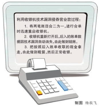 發(fā)現(xiàn)這個“秘密”后,楊某打起了歪主意!爱(dāng)天打烊時,我合了兩份單并重啟了收銀機(jī),利用技術(shù)漏洞銷掉其中一筆100元的賬,將已收的100元現(xiàn)金拿走。擔(dān)心了一夜,結(jié)果第二天風(fēng)平浪靜。”