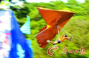 在這次的“鳥人賽”上,以往創(chuàng)造的25米飛行記錄終于被來自珠海本地的一名飛行愛好者打破。在昨天的飛行比賽中,珠海當?shù)匾患绎w行俱樂部的會員李志和駕駛著心愛的三角翼飛行器——“天翼弄人”在快速奔跑后,從8米高的高臺上向著前方的水面漂去,在一片掌聲中,李志和以26米的飛行距離創(chuàng)造了新的飛行記錄。