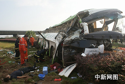 當(dāng)天上午7時(shí)40分,第一批消防救援隊(duì)員趕到事故現(xiàn)場(chǎng)。此時(shí),現(xiàn)場(chǎng)圍滿了群眾,呼聲、喊聲不斷,大客車則是面目全非,車頂和車身已經(jīng)有15度的傾斜,車頭嚴(yán)重變形,車身車窗玻璃盡碎。