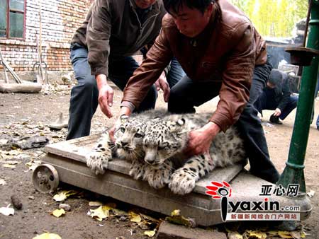 伊寧縣喀拉亞尕奇村牧民張培偉,今年5月10日,在山區(qū)放牧時撿回一對酷似草原斑貓的兩只小動物,并把這對“草原斑貓”帶回家,當成寵物飼養(yǎng),沒想到這兩只“斑貓”越長越像豹子。后經專家認定是國家一級保護動物——雪豹。如今這一雄一雌雪豹體重已達15公斤,每天需4-5公斤鮮肉喂養(yǎng),救助者張培偉已難承擔雪豹的“伙食”供應。但是雪豹作為國家保護的珍稀野生動物,既不能出售,又不宜放歸自然,加之在本地也沒有合適的救護地,只能由他繼續(xù)養(yǎng)護著,如今,越養(yǎng)越大的雪豹如一個燙手的山芋,讓張培偉陷入進退兩難的境地。