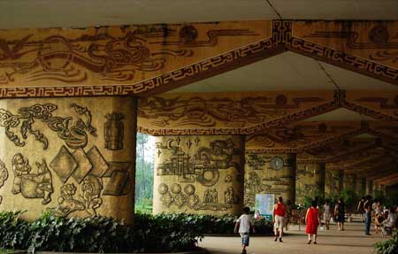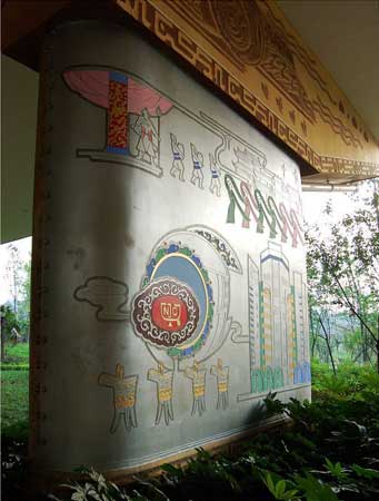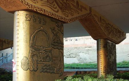 據(jù)有知情網(wǎng)友透露,這座“史上最牛的橋墩”來(lái)自四川德陽(yáng)市鼓樓下的成綿高速高架橋橋墩。橫亙?cè)诠臉桥c廣場(chǎng)之間的高速公路橋墩,成了設(shè)計(jì)者發(fā)揮想象的地方。設(shè)計(jì)者將28個(gè)橋墩進(jìn)行裝飾改造,以仿古浮雕銅板扣畫(huà)和仿敲銀浮雕扣版畫(huà)及大型仿烙鐵裝飾畫(huà)體現(xiàn)德陽(yáng)6縣(市、區(qū))歷史文化、風(fēng)景名勝、人文景觀及重裝基地風(fēng)采。整個(gè)壁畫(huà)長(zhǎng)廊立體感極強(qiáng),既抽象又寫(xiě)實(shí),色彩明朗,極具現(xiàn)代藝術(shù)風(fēng)格。彩虹橋、石刻、白馬關(guān)、龐統(tǒng)墓、倉(cāng)山大樂(lè)、黃繼光紀(jì)念館、三星堆、年畫(huà)館、劍南春……德陽(yáng)的標(biāo)志一一在此得以展現(xiàn),每個(gè)篇章把歷史文化、風(fēng)景名勝、人文景觀融為一體,形成一個(gè)完整的壁畫(huà)群落,壁畫(huà)面積達(dá)2309平方米,是整個(gè)德陽(yáng)地區(qū)景點(diǎn)的微縮!笆飞献钆5臉蚨铡庇2007年初推出,并受到當(dāng)?shù)仡I(lǐng)導(dǎo)的表?yè)P(yáng)。