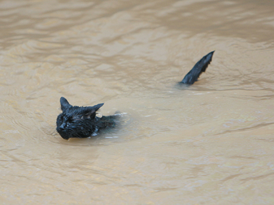 這只全身毛發(fā)黑亮黑亮的貓目前雖然沒(méi)有名字,但在長(zhǎng)江冬泳俱樂(lè)部200多名隊(duì)員中算是個(gè)明星了,盛名全仰仗它會(huì)游泳,這在天性怕水的貓科動(dòng)物中絕對(duì)算是一個(gè)異類。俱樂(lè)部成員桑長(zhǎng)江介紹,黑貓是5月中旬出生的,才半歲,可它的泳齡都有4個(gè)月了。7月中旬,一個(gè)隊(duì)員下午在下長(zhǎng)江游泳時(shí),不小心將這只在船邊玩耍的黑貓?zhí)叩浇锪耍蠹叶贾镭埡芎ε滤,以為黑貓?huì)很快被淹死,可它在湍急的江水里使勁撲騰,游到船邊被救了起來(lái),這讓在場(chǎng)的十幾個(gè)隊(duì)員都感到十分驚訝。而且從黑貓?jiān)谒飺潋v的姿勢(shì)看大家一致認(rèn)為,它是一個(gè)可以訓(xùn)練出來(lái)的游泳好手。