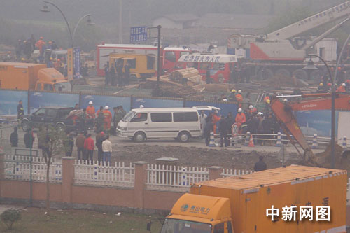 中新網(wǎng)杭州11月16日電(記者 龔讀法 實(shí)習(xí)生 王磊 姜越潮)2008年11月16日上午9時(shí)15分,浙江省杭州市蕭山區(qū)地鐵坍塌現(xiàn)場(chǎng),駛進(jìn)一量殯葬專用車,救援工作有序展開。16日上午11時(shí)將召開最新救援工作新聞發(fā)布會(huì),通報(bào)最新救援情況,并將在16日下午公布下一步救援方案。