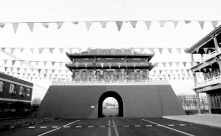 昨天,在位于通州區(qū)土橋新橋東側(cè)大約500米處皇木廠村村口,記者看到了這座仿古的城門樓——整座門樓至少30米高,樓身為紅色,只有一個(gè)門洞。