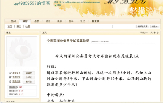 深圳公務員筆試在本月23日進行,24日一早就有考生對記者反映:今年深圳公務員考試題泄露了,他已經(jīng)在網(wǎng)絡上見到了標題為“今日深圳公務員考試答案驗證”的博客日志,顯示的發(fā)帖時間是23日的凌晨1時24分。該帖發(fā)布試題行政部分與“申論:房市、如何救市”的試題與他參加考試的試題完全一樣。