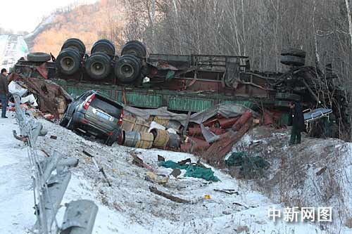 事故現(xiàn)場,一輛大貨車輪子超天側(cè)翻在路邊的深溝中,駕駛室嚴(yán)重扭曲變形,車上3人被困,路基下還有一輛長城吉普車,但該車體并沒有大礙,只是車內(nèi)人員輕微受傷。在此高速公路段,由于這輛事故大貨車滑入路邊的溝中,后面的多輛車見狀立即采取緊急制動剎車,一輛載滿一車乘客的麒麟集團的大客車從下坡發(fā)現(xiàn)就開始制動,由于路面濕滑,大客車失控在路中來回擺動最終滑出200米橫在路中,車內(nèi)乘客虛驚一場,所幸車內(nèi)并沒有乘客受傷,這時另一輛大貨車從上坡下來看見大客車橫在路中,司機也立即采取制動,將車撞向路中的隔離護欄,避免了一起重特大事故發(fā)生,在該貨車的后面100米,還有兩輛轎車不程度受損。