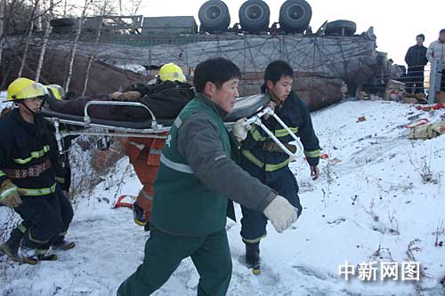 方正縣消防大隊的消防官兵立即趕到現(xiàn)場,使用液壓破拆工具立即對溝中變形的大貨車車體破拆,由于貨車車駕駛室已經(jīng)被撞癟,駕駛員在什么位置都看不到,這給救援的消防戰(zhàn)士帶來很大困難,消防戰(zhàn)士從先后從車內(nèi)狹小的空間救出2人。隨后,交警找來吊車將變形的車體吊起,消防戰(zhàn)士又使用破拆工具將變形的車體破拆開,此時駕駛員已被擠死在變形的車內(nèi)。