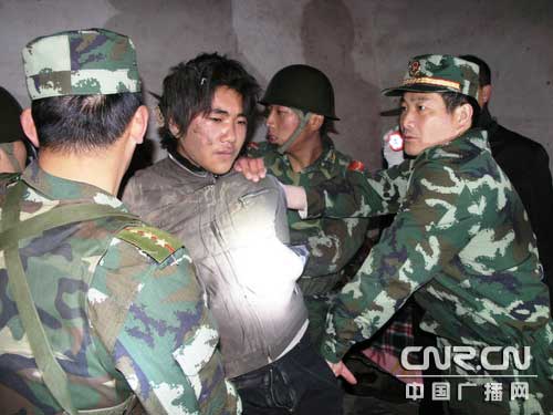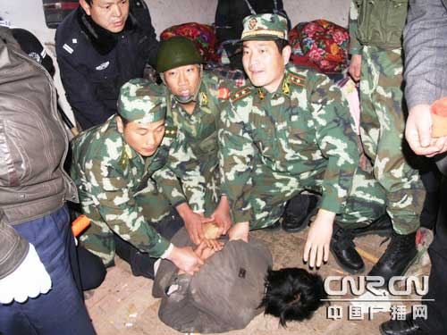 20時(shí)20分,案犯又要求其母送打火機(jī)吸煙。20時(shí)22分,在聯(lián)指授意下,其母讓案犯開(kāi)了燈,并告之家里沒(méi)有任何人,案犯放松警覺(jué),準(zhǔn)備開(kāi)門(mén)出來(lái)。盧參謀長(zhǎng)示意突擊組做好突擊準(zhǔn)備,在案犯開(kāi)門(mén)一剎那,孫參謀一手用強(qiáng)光疝氣燈照住案犯雙眼,趁案犯尚未反應(yīng)過(guò)來(lái),一手持應(yīng)急棍將案犯打倒在地,參戰(zhàn)官兵迅速將其生擒并帶離現(xiàn)場(chǎng)。