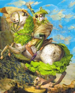 桔多淇在產(chǎn)生蔬菜作畫的想法后,就開始轉(zhuǎn)悠北京的菜市場。她去買菜,看到長相怪異的生姜,眼里就會大放異光,迅速下手,而走到賣豆腐的面前,也不說話,拿出相機(jī)就對著白花花的豆腐開拍。桔多淇說:“菜販以為是媒體搞衛(wèi)生監(jiān)督,嚇得不行,其實(shí)只是因?yàn)槲易觥蹲詈蟮耐聿汀返淖雷有枰艽笠粔K豆腐,我買回家也吃不完,于是就在菜市場拍了回家用電腦處理合成!苯鄱噤空f,她尋找原料的菜市場幾乎每一個菜攤她都“光顧”過,并且對菜市場邊角余料情有獨(dú)鐘,甚至還會四處“撿”菜。