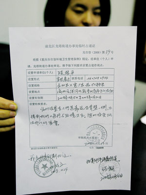 昨天下午,記者在觀音橋街道辦看到了張出示的那張《占道證》,全稱是龍市容(2008)第39號(hào)《渝北區(qū)龍塔街道辦事處臨時(shí)占道證》,印章蓋的是“渝北區(qū)市政綜合行政執(zhí)法局龍塔大隊(duì)”,發(fā)證時(shí)間為2008年10月13日!