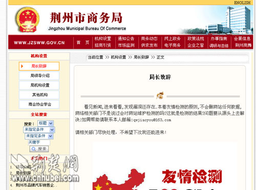 湖北荊州商務(wù)局網(wǎng)站再被黑 黑客留言稱友情檢測(cè)