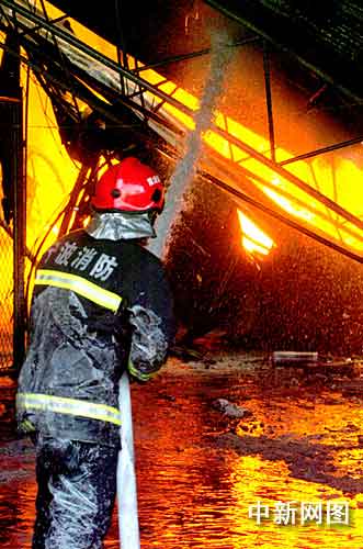 消防官兵迅速利用現(xiàn)場4輛大功率消防高噴車對(duì)著火場進(jìn)行撲救,由于官兵到場時(shí)火災(zāi)正處于猛烈燃燒階段,廠區(qū)內(nèi)的消防用水一時(shí)間得不到滿足,消防部門迅速組織車輛對(duì)周邊的河道進(jìn)行吸水,確保了現(xiàn)場用水的需要。