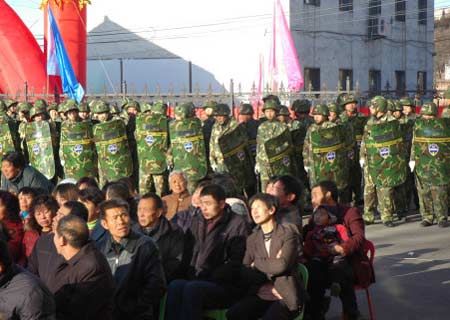 從照片上不難看出,“防暴隊”怎么會身著民兵服裝?西火鎮(zhèn)民兵連長郭江魚告訴記者,12月5日參加應(yīng)急演練沒有一名“防暴隊”干警,全部為民兵應(yīng)急分隊隊員。今年56歲、當了26年村支書的西火鎮(zhèn)豐北底村支部書記李搶澤對民兵應(yīng)急分隊在森林防火、搶險應(yīng)急等方面,發(fā)揮了重要作用。
